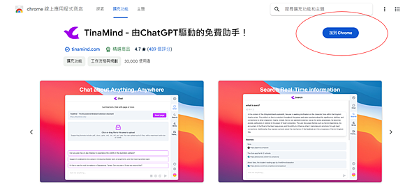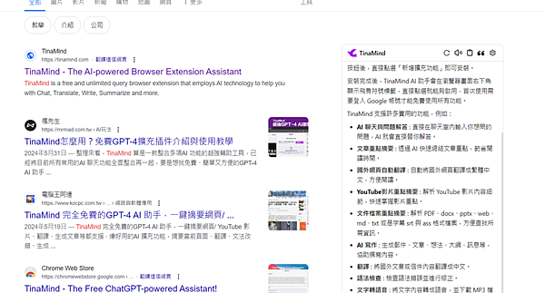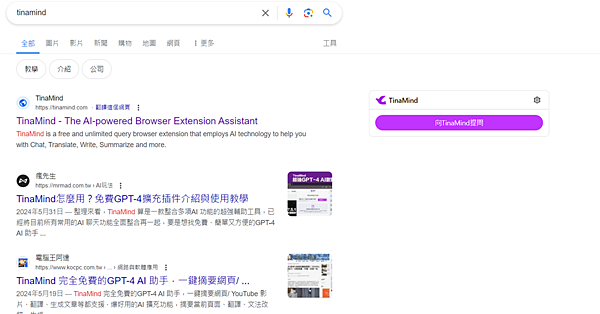 此外,在 Googe 搜尋任何東西,他都會直接安插在右邊;點擊【向Tinamind提問】,他就會幫你統整該頁面資訊~
