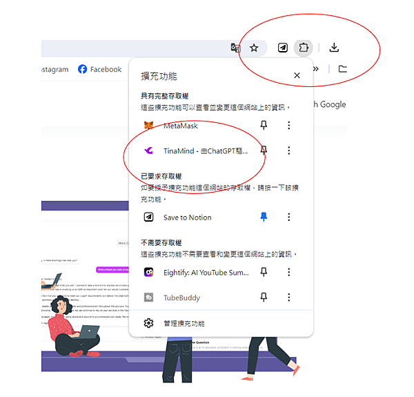 完成後,先點擊右上角【擴充功能】的符號,就會看到 Tinamind 在裡面了!按一下就可以開始使用~